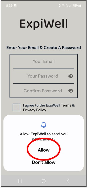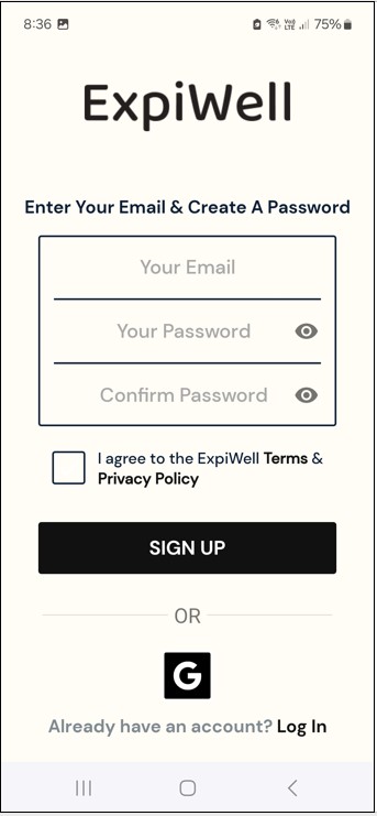 Step 6: Create an ExpiWell account. Enter your email address and create a password for the app. Tick to agree to the terms and privacy policy, and then press sign up.