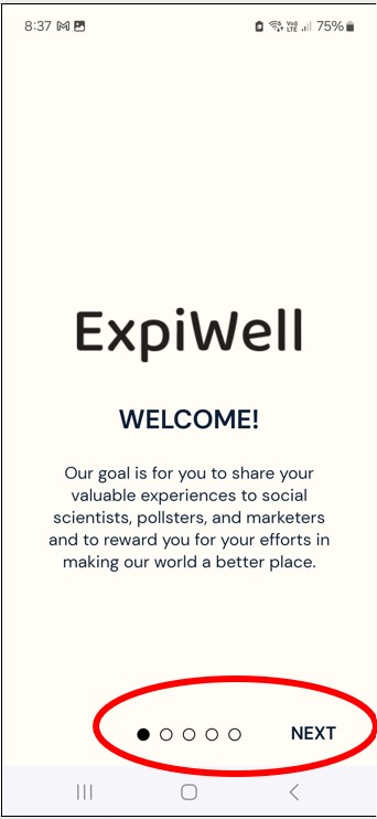 Step 8: You can now use the app! You will see a welcome screen that tells you about more about the app. Press next through the four screens. At some point during these next four screens, you may receive a message about battery saving and turning it off. Expiwell will not put a big drain on your phone’s battery life, so don’t worry about this. If this message comes up press ‘Go to Settings’. This will just make the message go away, and you can continue with the app set-up.