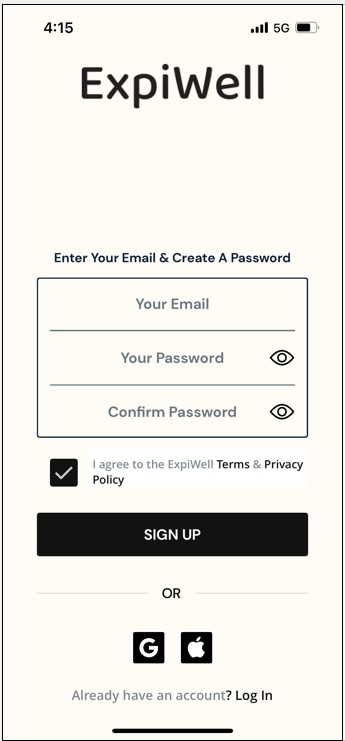 Step 5: Create an ExpiWell account. Enter your email address and create a password for the app. Tick to agree to the terms and privacy policy, and then press sign up.