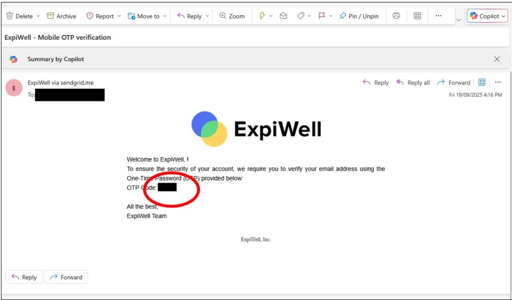 Step 6: You will now receive a one-time password (OTP) via email. This is a short string of numbers that will be sent to your email address. If you can’t see this email, make sure to check your junk/clutter folder. Enter the string of numbers into the ExpiWell app.