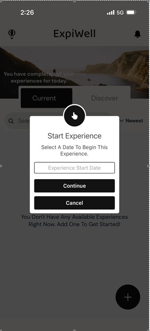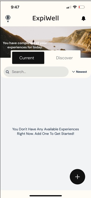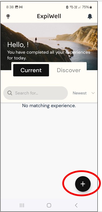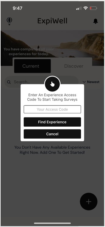 Step 9: The home screen of the app should look like this. Press the plus icon in the bottom right-hand corner of the app. A box will appear that asks you to enter an “experience access code”.